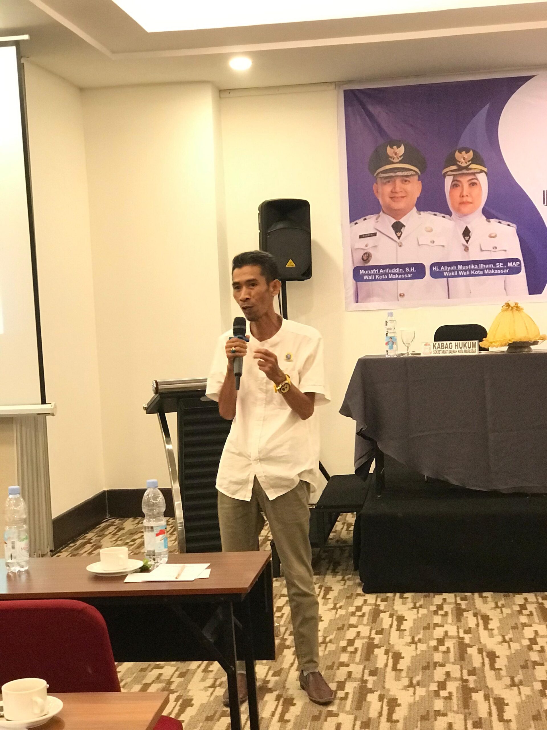 Pemateri merupakan bagian dari Tim Hukum kota Makassar dimana materi yang dipaparkan berupa Implementasi Produk Hukum Daerah di Kota Makassar dengan harapan bisa terealisasikan dengan baik.